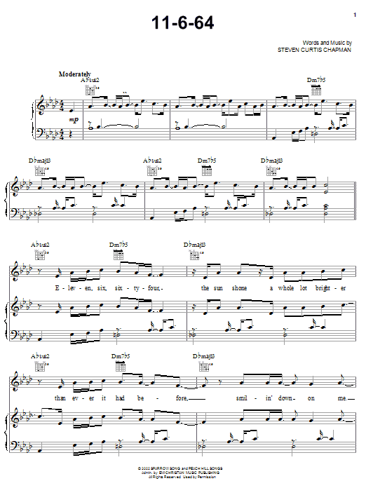 Download or print Steven Curtis Chapman 11-6-64 sheet music, chords and digital score arranged for Piano, Vocal & Guitar Chords (Right-Hand Melody). This Christian score includes 5 page(s).