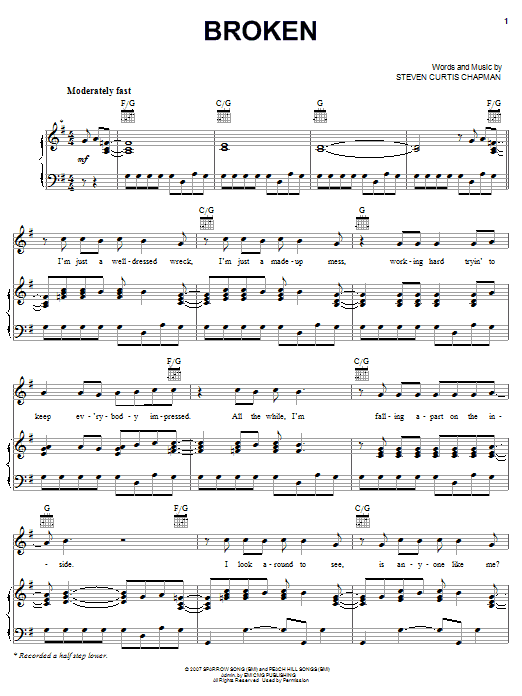 Download or print Steven Curtis Chapman Broken sheet music, chords and digital score arranged for Piano, Vocal & Guitar Chords (Right-Hand Melody). This Christian score includes 7 page(s).