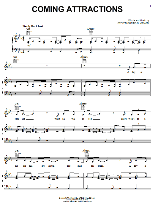 Download or print Steven Curtis Chapman Coming Attractions sheet music, chords and digital score arranged for Piano, Vocal & Guitar Chords (Right-Hand Melody). This Christian score includes 8 page(s).
