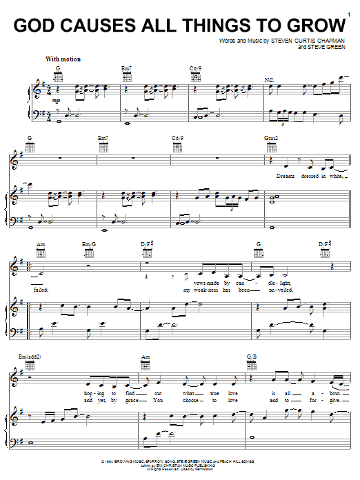 Download or print Steven Curtis Chapman God Causes All Things To Grow sheet music, chords and digital score arranged for Piano, Vocal & Guitar Chords (Right-Hand Melody). This Christian score includes 4 page(s).