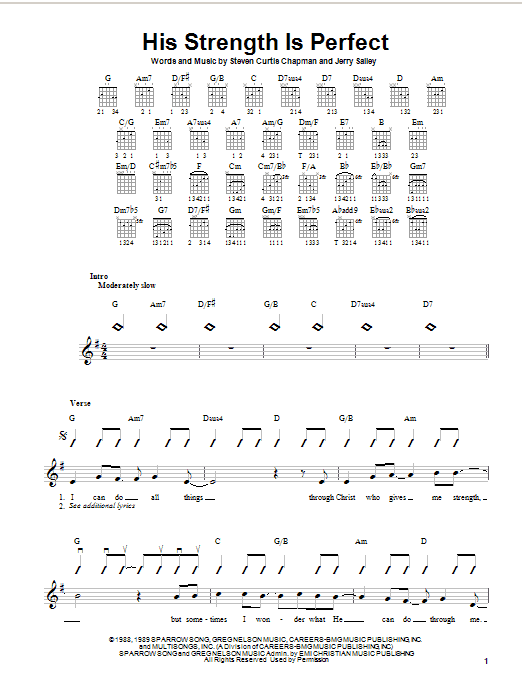 Download or print Steven Curtis Chapman His Strength Is Perfect sheet music, chords and digital score arranged for Piano, Vocal & Guitar Chords (Right-Hand Melody). This Christian score includes 6 page(s).
