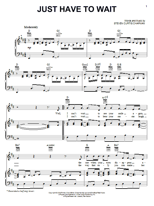 Download or print Steven Curtis Chapman Just Have To Wait sheet music, chords and digital score arranged for Piano, Vocal & Guitar Chords (Right-Hand Melody). This Christian score includes 8 page(s).