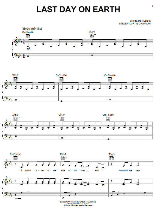 Download or print Steven Curtis Chapman Last Day On Earth sheet music, chords and digital score arranged for Piano, Vocal & Guitar Chords (Right-Hand Melody). This Christian score includes 8 page(s).
