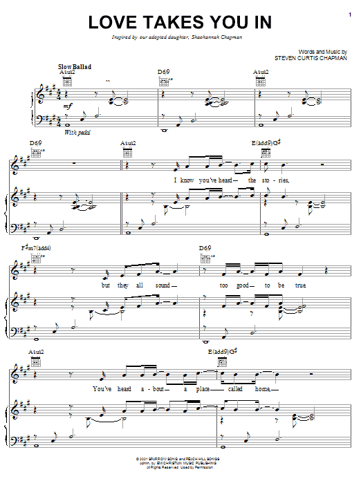 Download or print Steven Curtis Chapman Love Takes You In sheet music, chords and digital score arranged for Piano, Vocal & Guitar Chords (Right-Hand Melody). This Christian score includes 8 page(s).