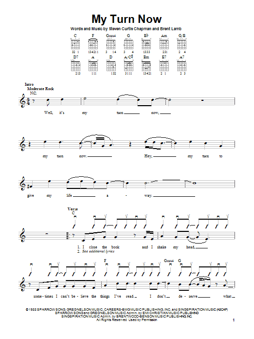 Download or print Steven Curtis Chapman My Turn Now sheet music, chords and digital score arranged for Piano, Vocal & Guitar Chords (Right-Hand Melody). This Christian score includes 6 page(s).