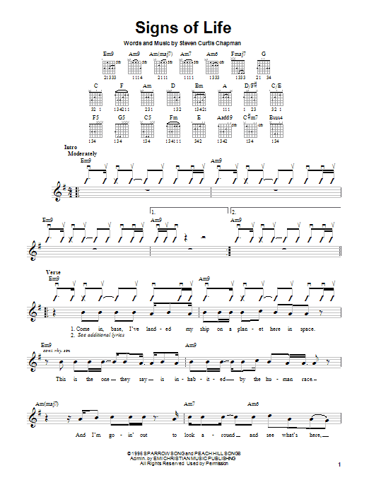 Download or print Steven Curtis Chapman Signs Of Life sheet music, chords and digital score arranged for Piano, Vocal & Guitar Chords (Right-Hand Melody). This Sacred score includes 9 page(s).