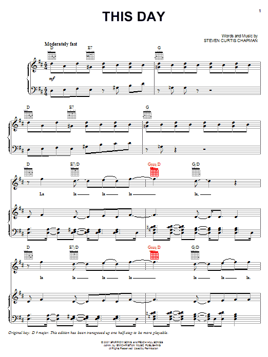 Download or print Steven Curtis Chapman This Day sheet music, chords and digital score arranged for Piano, Vocal & Guitar Chords (Right-Hand Melody). This Christian score includes 11 page(s).