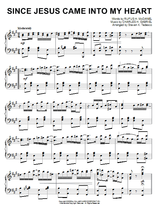 Download or print Steven Tedesco Since Jesus Came Into My Heart [Ragtime version] sheet music, chords and digital score arranged for Piano Solo. This Christian score includes 2 page(s).
