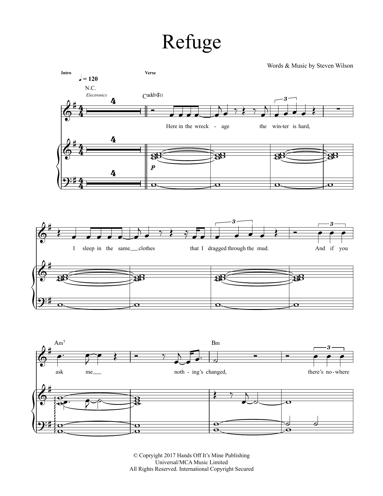 Download or print Steven Wilson Refuge sheet music, chords and digital score arranged for Piano & Vocal. This Pop score includes 13 page(s).