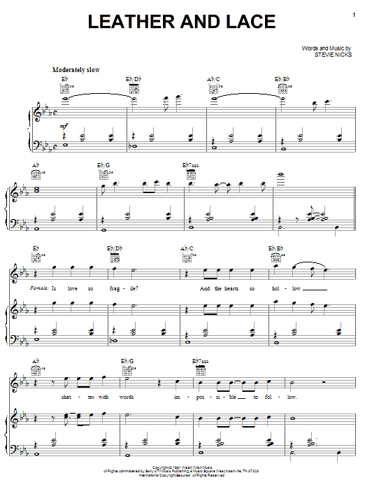 Download or print Stevie Nicks Leather And Lace sheet music, chords and digital score arranged for Piano, Vocal & Guitar Chords (Right-Hand Melody). This Pop score includes 7 page(s).