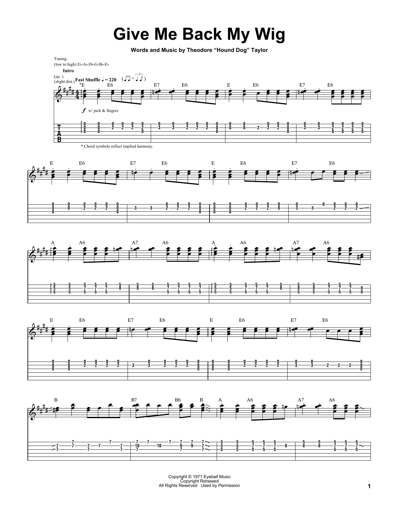 Download or print Stevie Ray Vaughan Give Me Back My Wig sheet music, chords and digital score arranged for Guitar Tab. This Blues score includes 7 page(s).