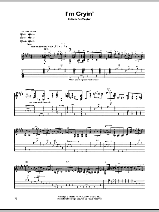 Download or print Stevie Ray Vaughan I'm Cryin' sheet music, chords and digital score arranged for Guitar Tab. This Blues score includes 9 page(s).