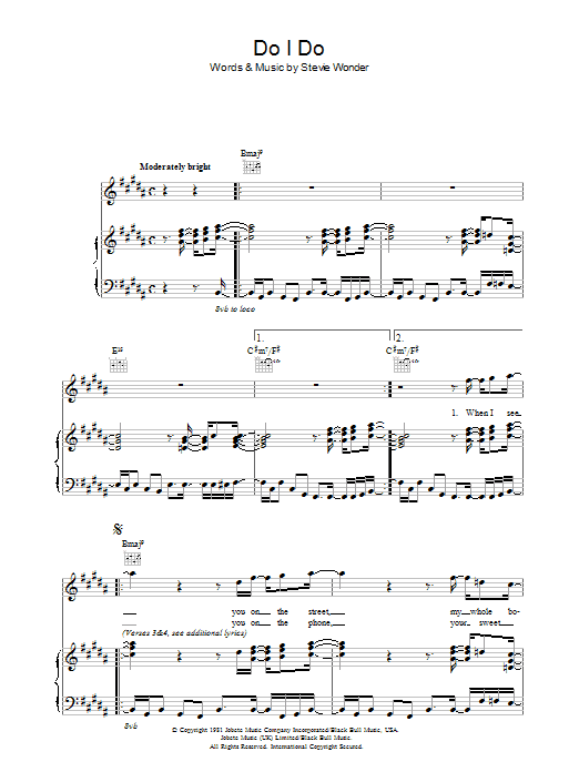 Download or print Stevie Wonder Do I Do sheet music, chords and digital score arranged for Piano, Vocal & Guitar Chords (Right-Hand Melody). This Pop score includes 6 page(s).