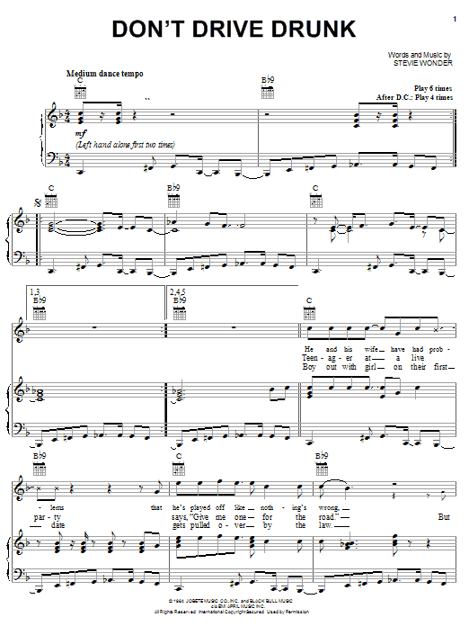 Download or print Stevie Wonder Don't Drive Drunk sheet music, chords and digital score arranged for Piano, Vocal & Guitar Chords (Right-Hand Melody). This Pop score includes 5 page(s).