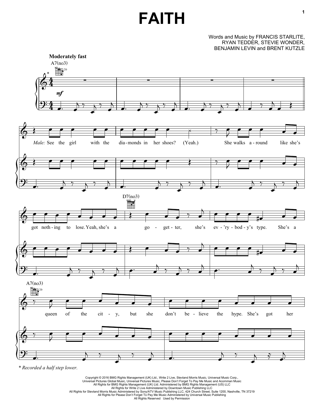 Download or print Stevie Wonder feat. Ariana Grande Faith sheet music, chords and digital score arranged for Piano, Vocal & Guitar Chords (Right-Hand Melody). This Pop score includes 8 page(s).