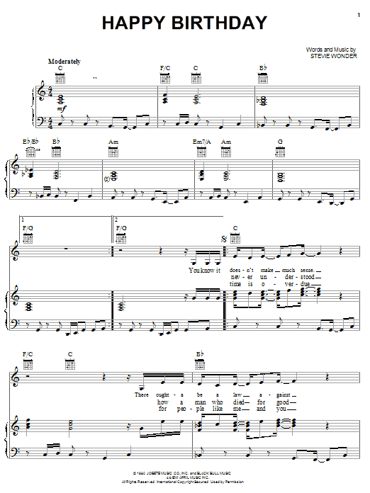 Download or print Stevie Wonder Happy Birthday sheet music, chords and digital score arranged for Piano, Vocal & Guitar Chords. This Pop score includes 6 page(s).
