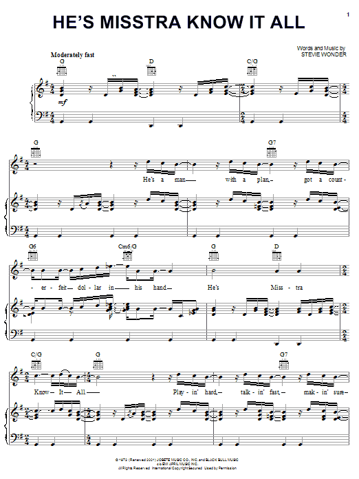 Download or print Stevie Wonder He's Misstra Know It All sheet music, chords and digital score arranged for Piano, Vocal & Guitar Chords (Right-Hand Melody). This Pop score includes 6 page(s).