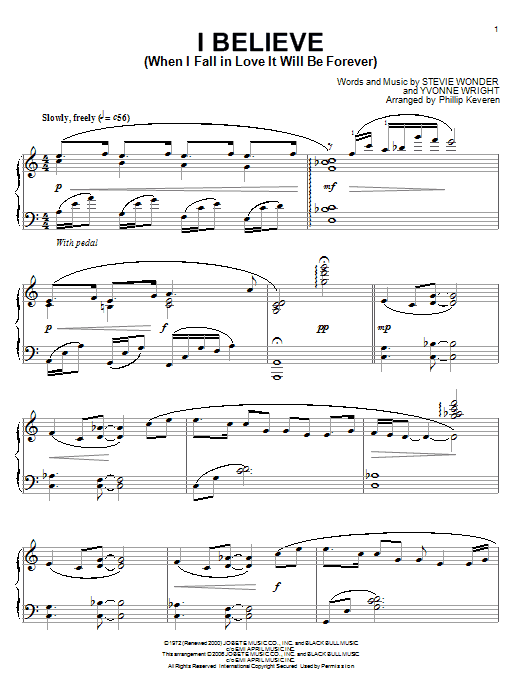 Download or print Stevie Wonder I Believe (When I Fall In Love It Will Be Forever) (arr. Phillip Keveren) sheet music, chords and digital score arranged for Piano Solo. This Pop score includes 3 page(s).