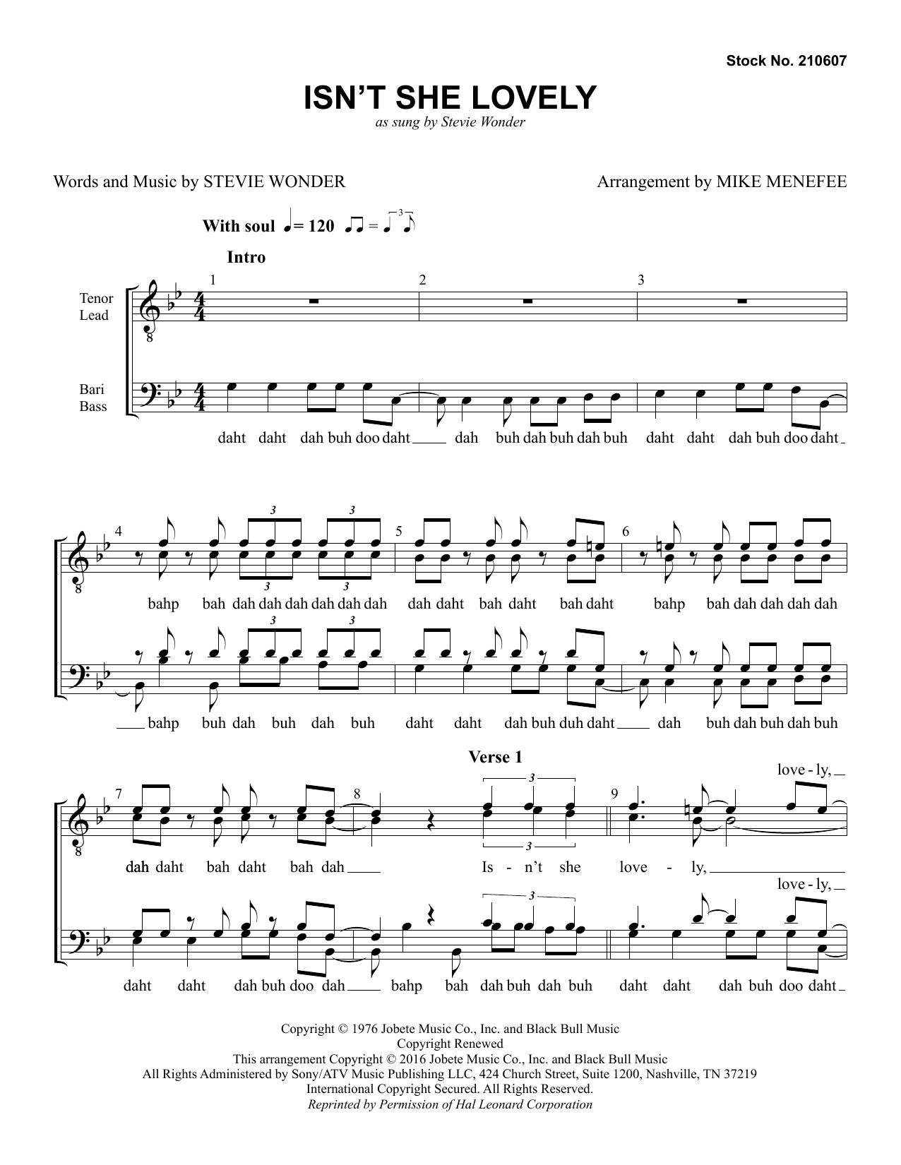 Download or print Stevie Wonder Isn't She Lovely (arr. Mike Menefee) sheet music, chords and digital score arranged for TTBB Choir. This Barbershop score includes 7 page(s).