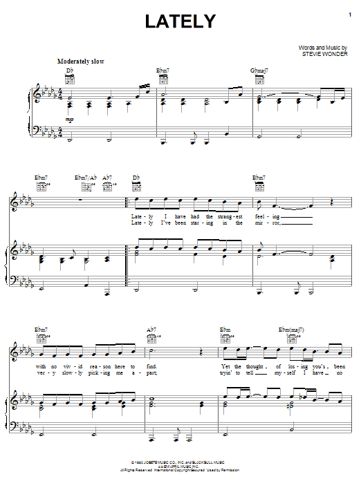 Download or print Stevie Wonder Lately sheet music, chords and digital score arranged for Piano, Vocal & Guitar Chords (Right-Hand Melody). This Love score includes 5 page(s).