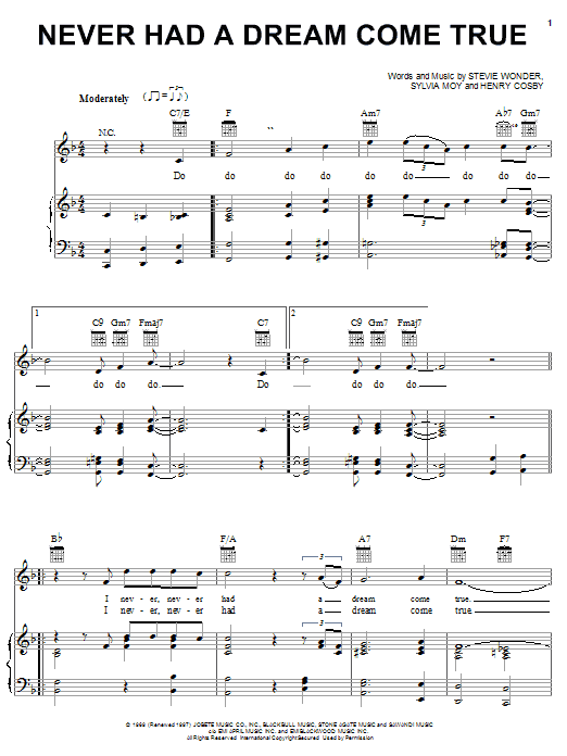 Download or print Stevie Wonder Never Had A Dream Come True sheet music, chords and digital score arranged for Guitar Chords/Lyrics. This Pop score includes 2 page(s).