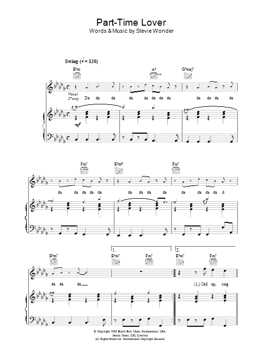 Download or print Stevie Wonder Part Time Lover sheet music, chords and digital score arranged for Piano, Vocal & Guitar Chords (Right-Hand Melody). This Pop score includes 6 page(s).