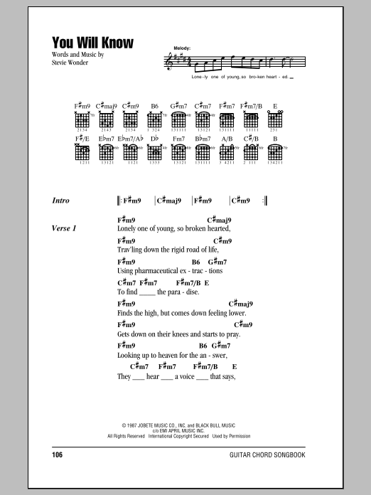 Download or print Stevie Wonder You Will Know sheet music, chords and digital score arranged for Guitar Chords/Lyrics. This Pop score includes 4 page(s).