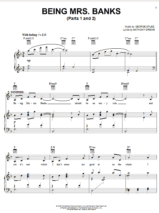 Download or print Anthony Drewe Being Mrs. Banks (Parts 1 and 2) sheet music, chords and digital score arranged for Piano & Vocal. This Disney score includes 6 page(s).