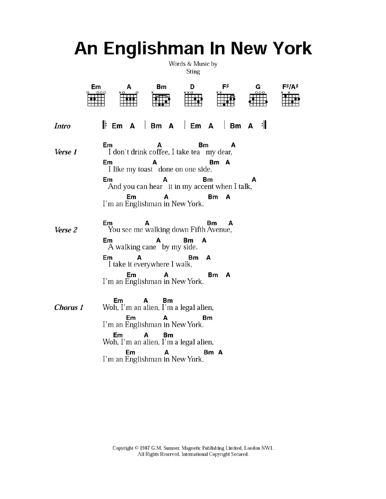 Download or print Sting An Englishman In New York sheet music, chords and digital score arranged for Piano Chords/Lyrics. This Rock score includes 2 page(s).
