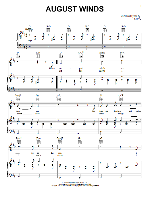 Download or print Sting August Winds sheet music, chords and digital score arranged for Piano, Vocal & Guitar Chords (Right-Hand Melody). This Pop score includes 4 page(s).