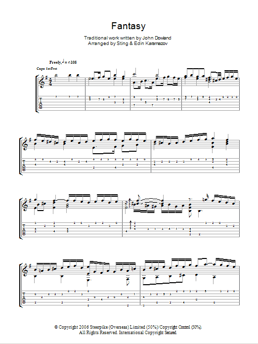Download or print John Dowland Fantasy (as performed by Sting and Edin Karamazov) sheet music, chords and digital score arranged for Guitar Tab. This Classical score includes 4 page(s).