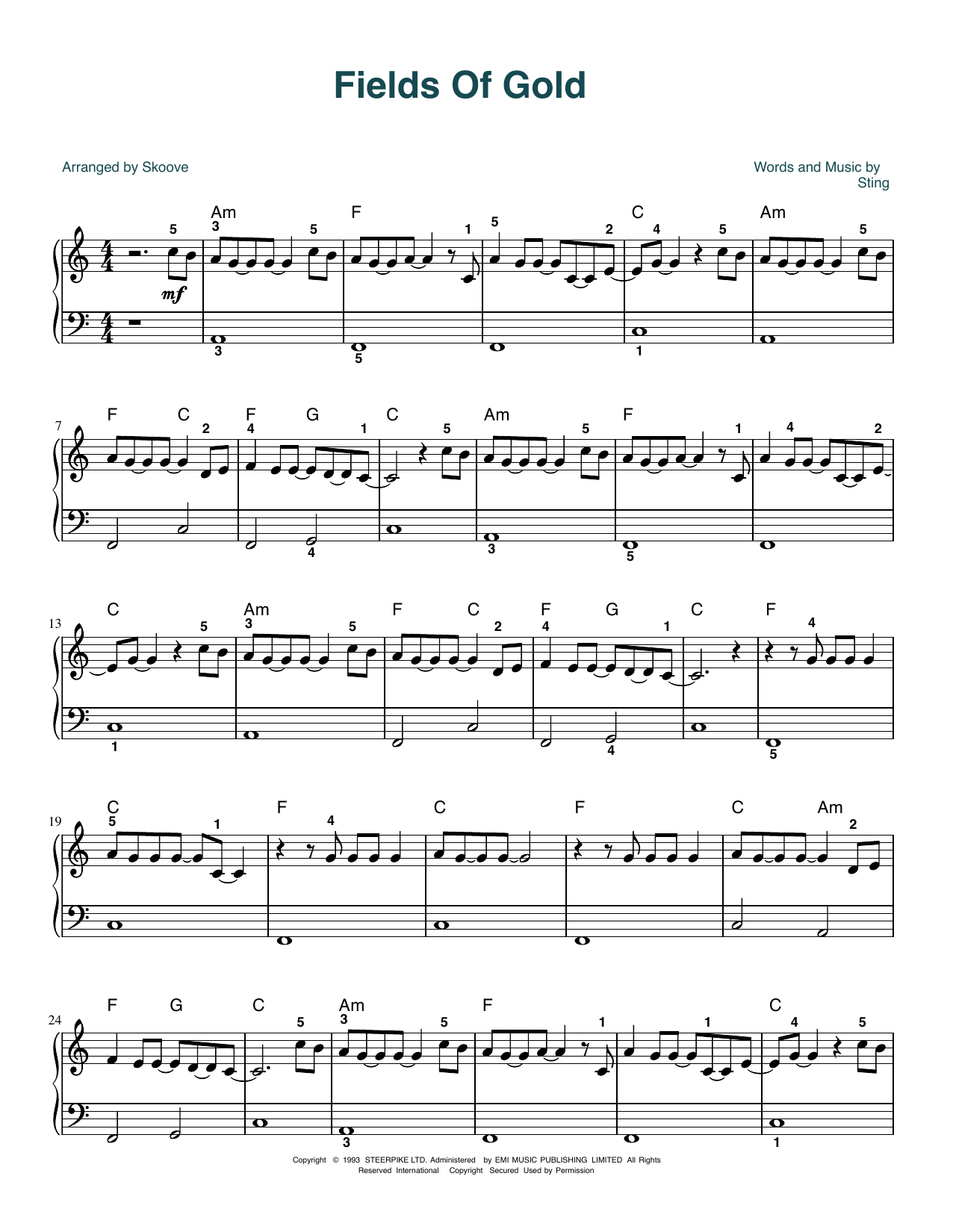 Download or print Sting Fields Of Gold (arr. Skoove) sheet music, chords and digital score arranged for Easy Piano. This Pop score includes 2 page(s).