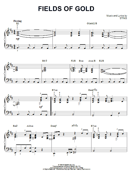 Download or print Sting Fields Of Gold [Jazz version] (arr. Brent Edstrom) sheet music, chords and digital score arranged for Piano Solo. This Love score includes 5 page(s).