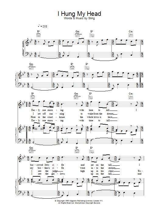 Download or print Sting I Hung My Head sheet music, chords and digital score arranged for Piano, Vocal & Guitar Chords. This Pop score includes 5 page(s).