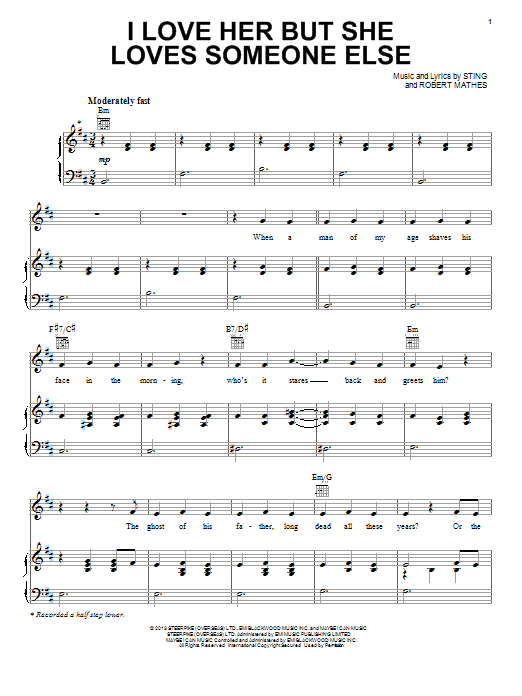 Download or print Sting I Love Her But She Loves Someone Else sheet music, chords and digital score arranged for Piano, Vocal & Guitar Chords (Right-Hand Melody). This Pop score includes 8 page(s).