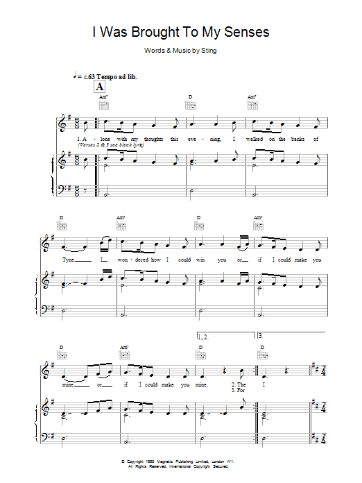 Download or print Sting I Was Brought To My Senses sheet music, chords and digital score arranged for Piano, Vocal & Guitar Chords. This Pop score includes 5 page(s).