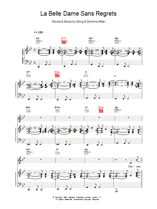 Download or print Sting La Belle Dame Sans Regrets sheet music, chords and digital score arranged for Piano, Vocal & Guitar Chords. This Pop score includes 7 page(s).