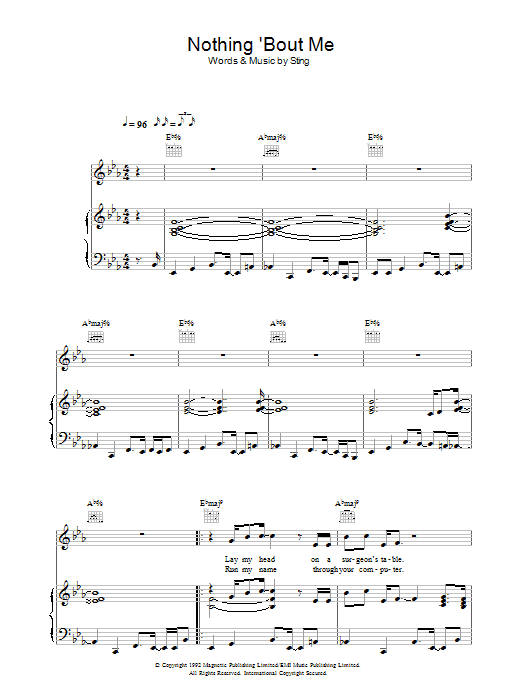 Download or print Sting Nothing 'Bout Me sheet music, chords and digital score arranged for Piano, Vocal & Guitar Chords. This Pop score includes 6 page(s).