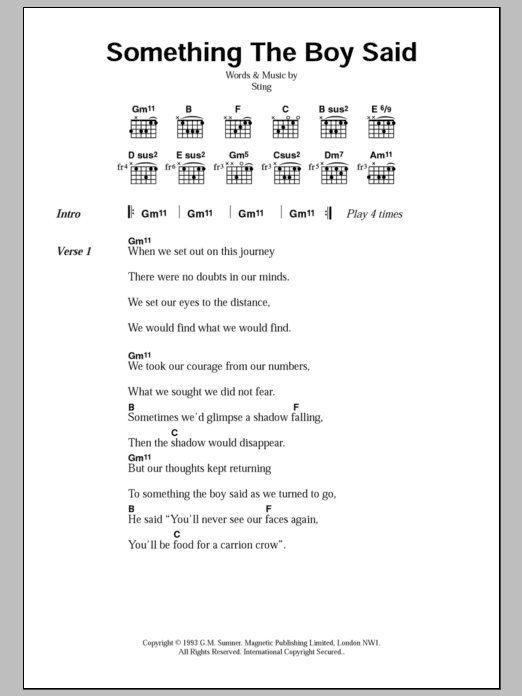 Download or print Sting Something The Boy Said sheet music, chords and digital score arranged for Guitar Chords/Lyrics. This Rock score includes 3 page(s).