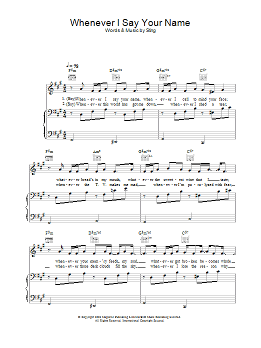 Download or print Sting Whenever I Say Your Name sheet music, chords and digital score arranged for Piano, Vocal & Guitar Chords (Right-Hand Melody). This Pop score includes 8 page(s).