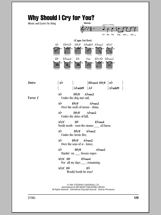 Download or print Sting Why Should I Cry For You? sheet music, chords and digital score arranged for Piano, Vocal & Guitar Chords (Right-Hand Melody). This Pop score includes 6 page(s).