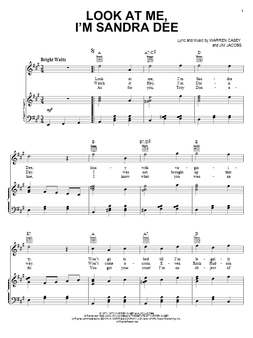 Download or print Stockard Channing Look At Me, I'm Sandra Dee (from Grease) sheet music, chords and digital score arranged for Piano, Vocal & Guitar Chords (Right-Hand Melody). This Musical/Show score includes 4 page(s).