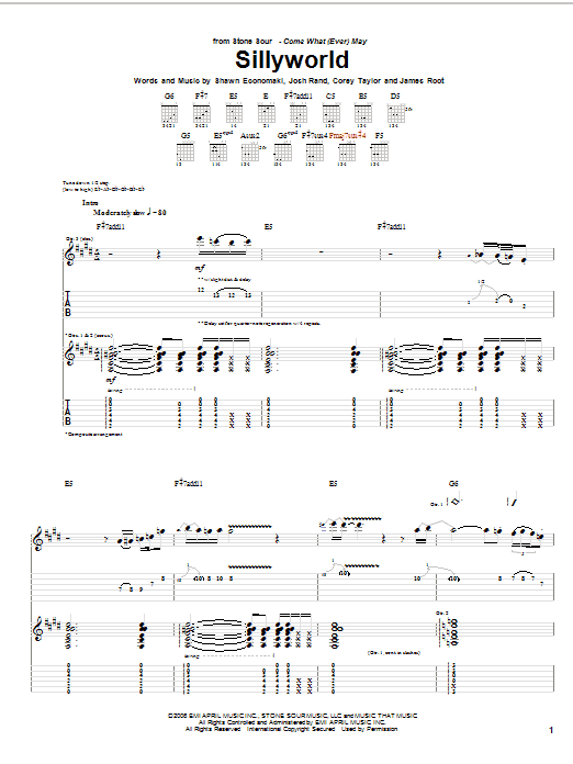 Download or print Stone Sour Sillyworld sheet music, chords and digital score arranged for Guitar Tab. This Metal score includes 13 page(s).