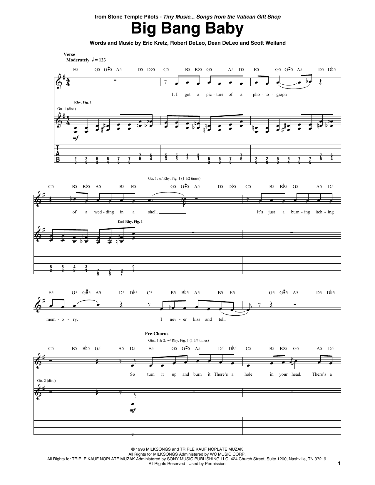 Download or print Stone Temple Pilots Big Bang Baby sheet music, chords and digital score arranged for Guitar Tab. This Rock score includes 7 page(s).