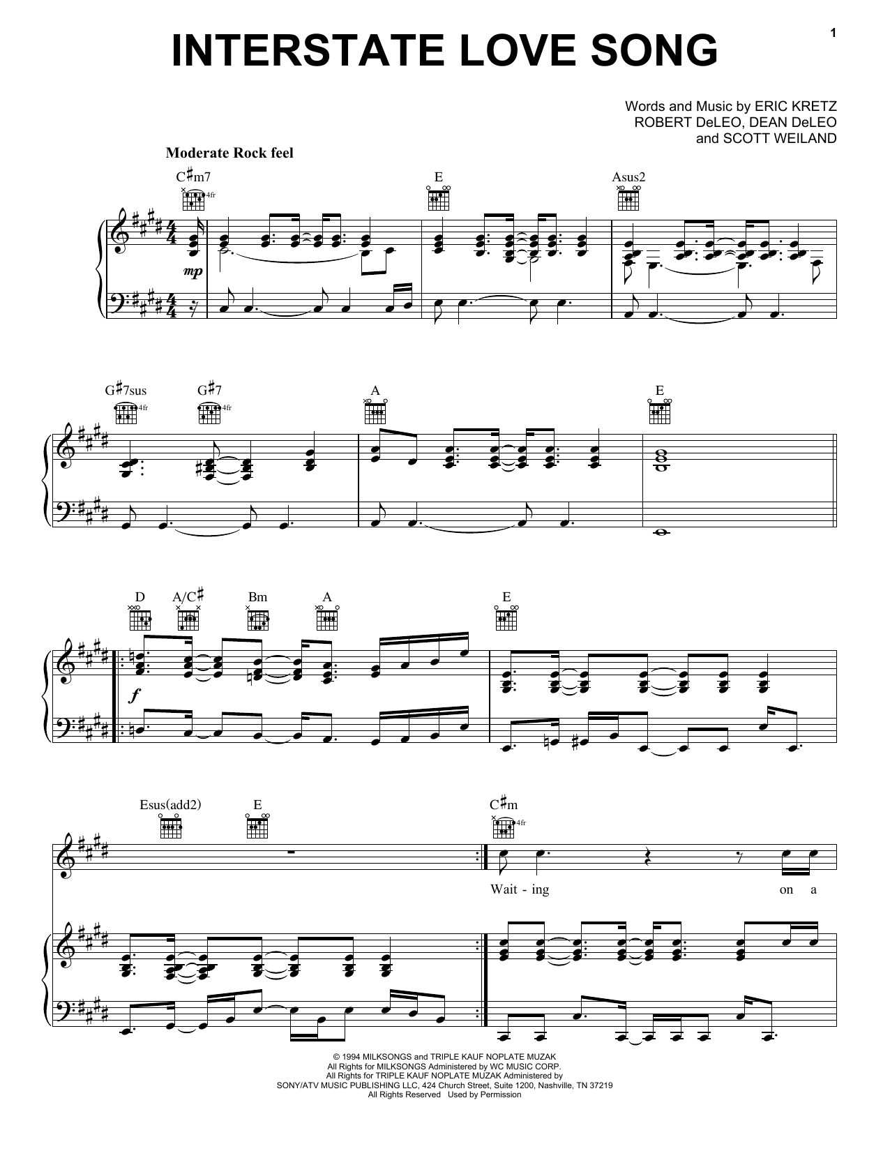 Download or print Stone Temple Pilots Interstate Love Song sheet music, chords and digital score arranged for Piano, Vocal & Guitar Chords (Right-Hand Melody). This Metal score includes 6 page(s).