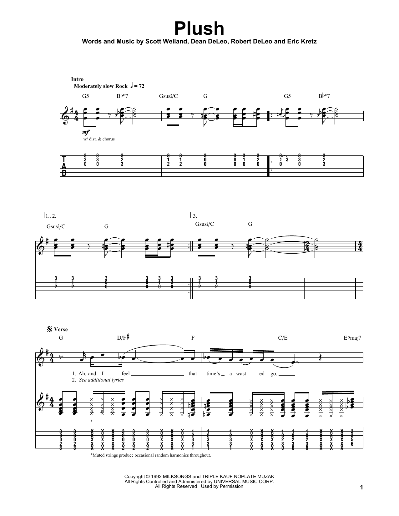Download or print Stone Temple Pilots Plush sheet music, chords and digital score arranged for Easy Bass Tab. This Pop score includes 3 page(s).