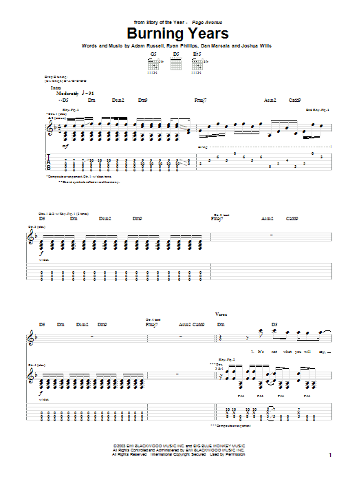 Download or print Story Of The Year Burning Years sheet music, chords and digital score arranged for Guitar Tab. This Rock score includes 9 page(s).