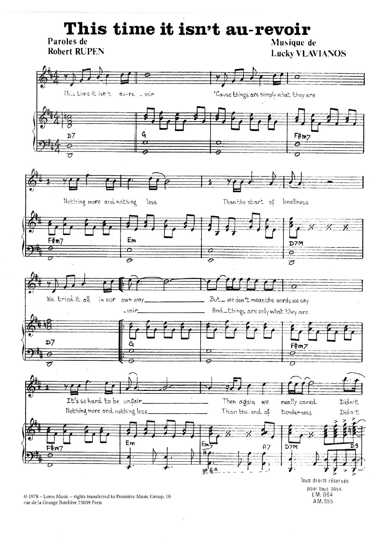 Download or print Stylianos Vlavianos This Time It Isn't Au Revoir sheet music, chords and digital score arranged for Piano & Vocal. This Standards score includes 2 page(s).