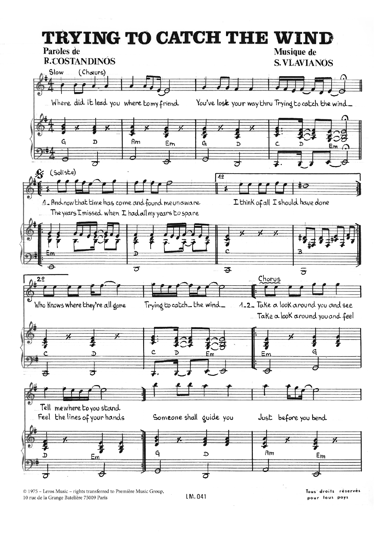 Download or print Stylianos Vlavianos Trying To Catch The Wind sheet music, chords and digital score arranged for Piano & Vocal. This Standards score includes 2 page(s).