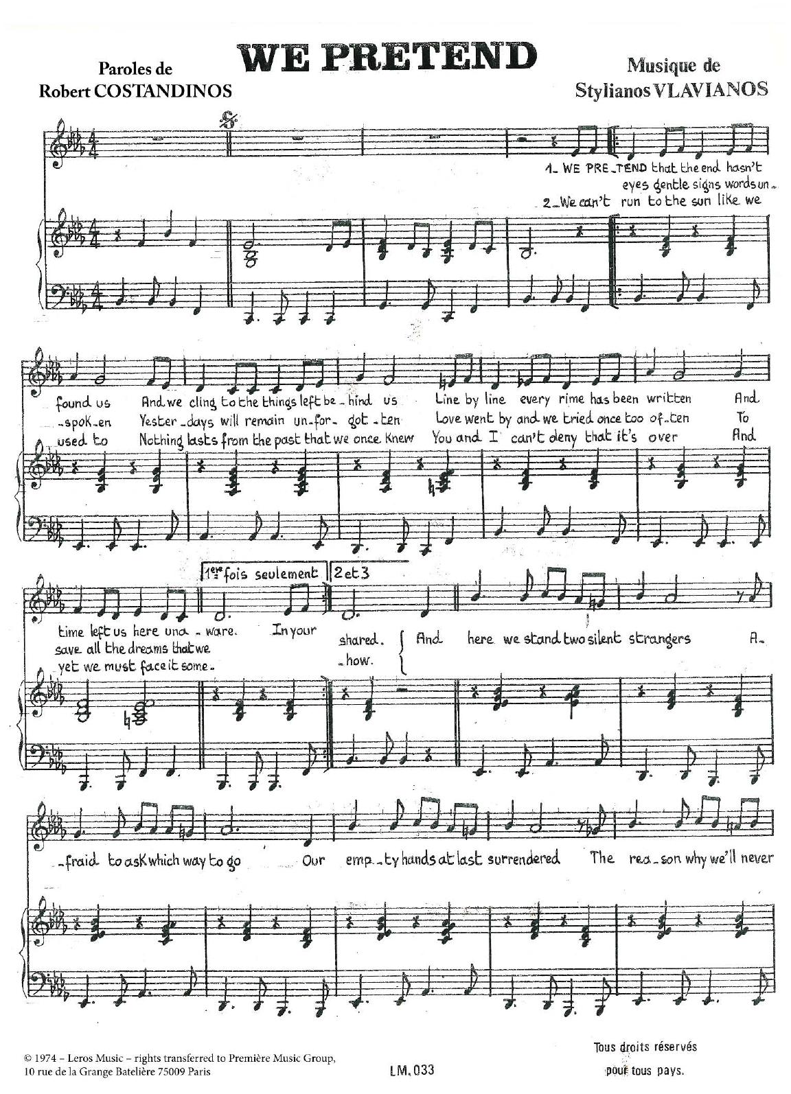 Download or print Stylianos Vlavianos We Pretend sheet music, chords and digital score arranged for Piano & Vocal. This Standards score includes 2 page(s).